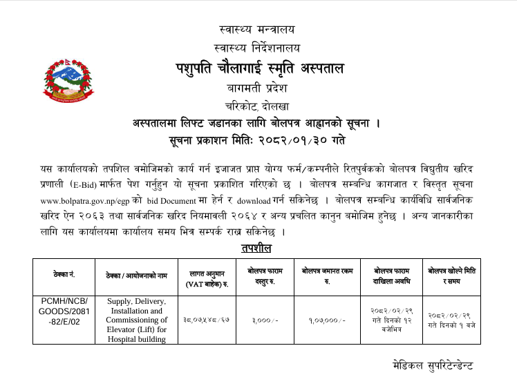 अस्पतालमा लिफ्ट जडानका लागि बाेलपत्र आवहानकाे सुचना ।