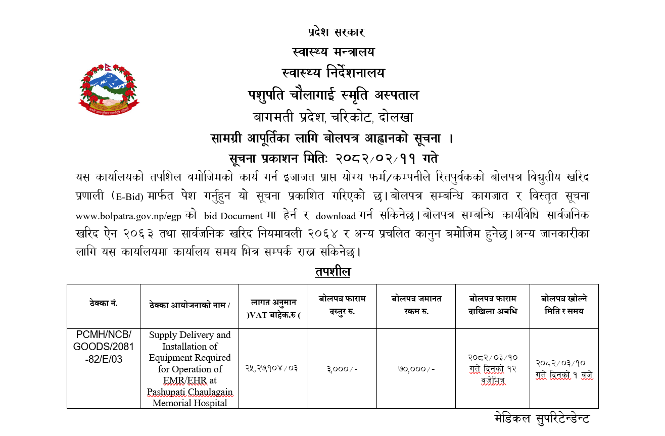 सामाग्रि आपूर्तिका लागि बाेलपत्र आवहानकाे सूचना